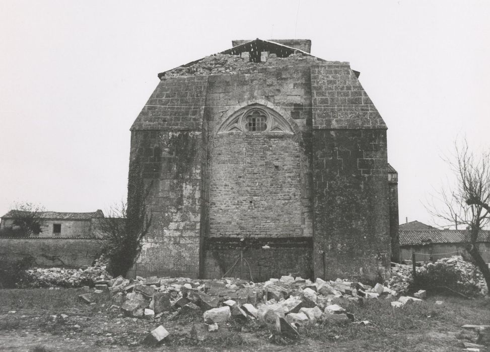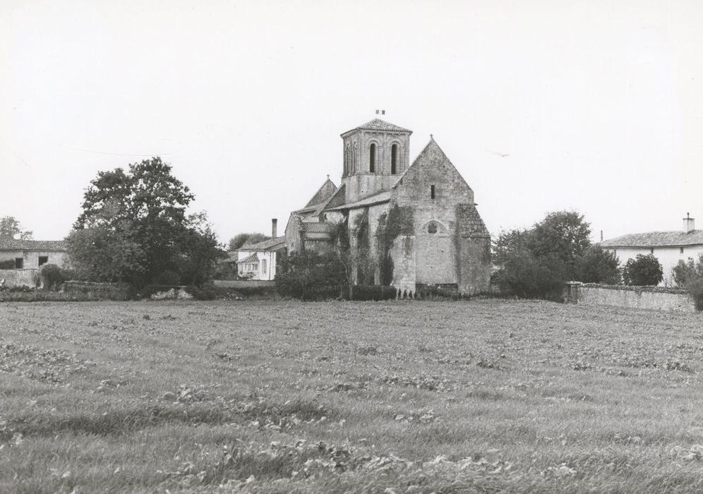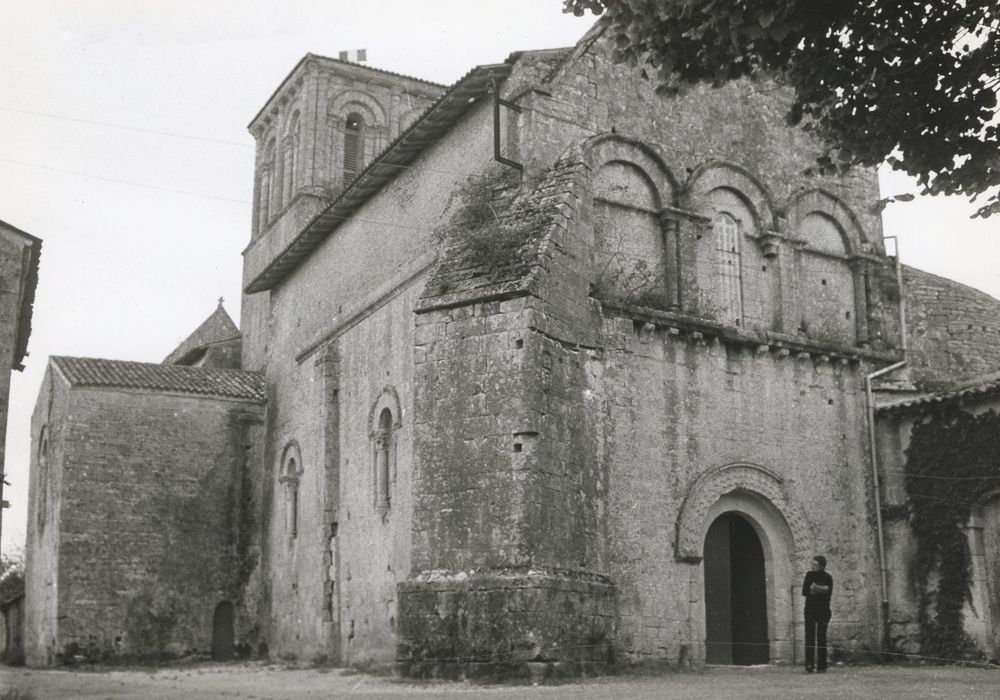 Les destructions entraînées par l'occupation anglaise expliquent les transformations subies par l'église au cours du 15e siècle. Construite sur un plan en croix latine, elle comprend une nef et un clocher de style roman tandis que le chevet a été réédifié au 15e siècle. La façade s'ouvre par un portail à deux voussures. A l'étage, trois arcatures posées sur des colonnettes, encadrent et abritent une fenêtre d'axe. Le tout est coiffé d'un mur pignon qui se retrouve également au chevet. L'élévation nord est percée de fenêtres du 12e siècle richement ornées. L'abside primitive, demi-circulaire, a été abattue et remplacée par un chevet plat gothique percé d'une verrière flamboyante. Le clocher carré, à un étage, est un beau spécimen d'art roman. Il est orné, sur chacune de ses faces, de deux fenêtres en plein cintre avec colonnettes. La façade actuelle, malgré son style 12e siècle, a dû être remontée à une époque postérieure, l'ancienne devant s'élever plus à l'ouest. A l'intérieur, quatre massifs formés de colonnes portent une coupole sur trompes. Un transept avec absidiole, sans cul de four, complète l'ensemble. Des traces de fresques (15e siècle ?) sont visibles dans l'absidiole nord.