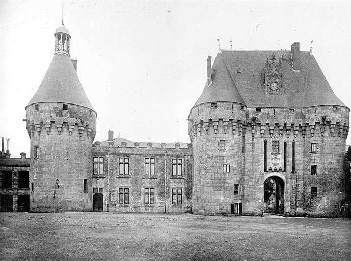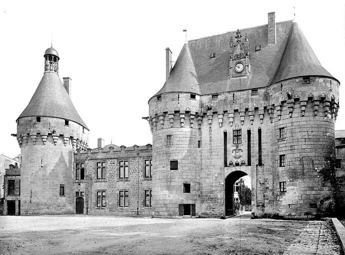 Tours, poterne et fontaine du sous-sol : 17e siècle ; Salle de théâtre : 3e quart 19e siècle. De l'ancien château féodal, il ne reste plus que la poterne et une tour isolée, reliée au corps principal par une grande salle. Le fossé devant le pont-levis a été comblé pour permettre la communication de la place publique aux bâtiments de l'hôtel de ville et de la sous-préfecture. Les tours flanquant la poterne ont conservé leurs défenses. A chacune, les archères ont été conservées ou agrandies. Des escaliers de pierre desservent chaque étage et accèdent au chemin de ronde. Ce passage semble avoir été découvert, comme en témoignent les gargouilles. Le crénelage comporte mâchicoulis avec archères au milieu des merlons. La fontaine située au sous-sol de la sous-préfecture, présente une niche et un encadrement de niche ornés de sculptures imitant des stalactites. Masque sculpté. La fontaine a probablement été édifiée par Léon de Sainte-Maure, comte de Jonzac, qui agrandit et embellit le château au milieu du 17e siècle. Dans une ancienne cour de servitude du château, un théâtre a été construit au 19e siècle, le plan définitif ayant été approuvé en 1861. Il s'agit d'un édifice en rond de 300 places environ. Deux étages sont aménagés en loges. Les cloisons des couloirs et galerie délimitant les loges ont été supprimées vers 1950. Les travaux de peinture et de décoration de la salle, ainsi que les décors, devaient être confiés à M. Betton, décorateur du théâtre français de Bordeaux.