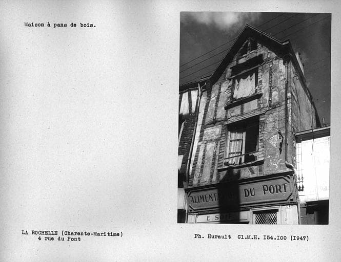 Cette construction est située dans l'une des plus anciennes rues de La Rochelle qui aboutissait à la "grande rive" qui s'étendait de la tour de la Chaîne au pont Saint-Sauveur. Elle était défendue, sur la "grande rive", par une porte qui faisait partie de l'enceinte créée autour du port au 14e siècle. Ce sont, avec l'immeuble n°6 rue du Port, les deux seuls édifices du 15e ou 16e sècle, subsistant encore. En façade, pans de bois avec colombage empli de briques recouvertes d'un enduit au mortier de chaux. Les bois sont protégés par des ardoises clouées. Le rez-de-chaussée présente une large ouverture pour la boutique.