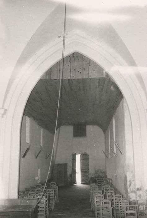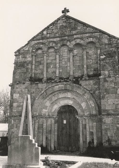 Du 12e siècle, l'église n'a conservé de sa construction primitive que sa façade, une partie de sa tour d'escalier et une cuve baptismale. L'édifice est à nef unique et clocher carré. La façade s'ouvre par un portail à trois voussures séparées par des cordons de pointes de diamants et d'entrelacs. La partie supérieure des colonnes soutenant les voussures, est ornée de torsades. Deux motifs géométriques séparent les colonnes des voussures, ainsi que le rez-de-chaussée du premier étage constitué d'une série de cinq arcatures. Le tout est surmonté d'un pignon.