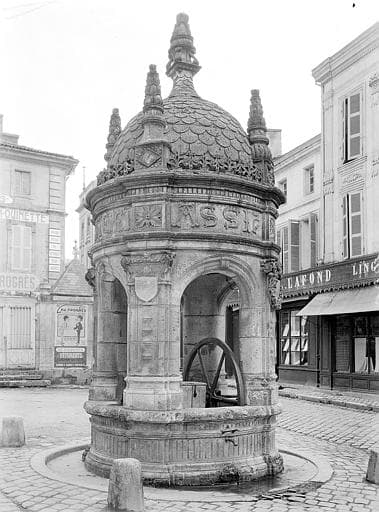 Margelle de puits monumentale, de style Renaissance, provenant du château de Brizamboug (Charente Maritime) dont elle est le seul vestige. Edifiée en 1819 sur l'ancien puits du canton du Pilori.