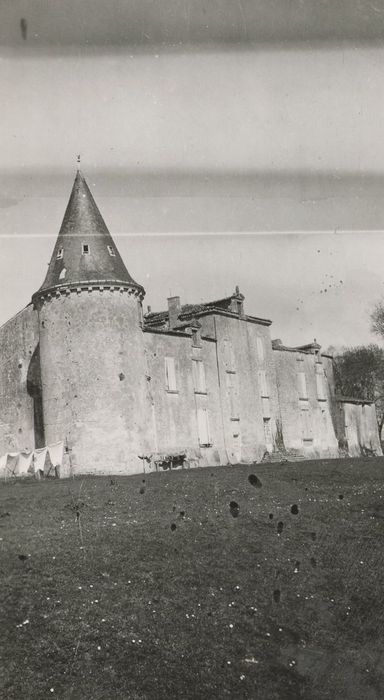 Logis du 17e siècle ayant remplacé un château plus ancien dont il reste une grosse tour à l'angle sud-ouest. Le corps de bâtiment central s'ouvre par une porte Louis XIII. Cette porte à arc surbaissé est encadrée de pilastres cannelés, avec écoinçons ornés de feuillages. La frise qui les surmonte est formée de rinceaux de feuillages et, au-dessus des pilastres, de feuilles d'acanthe. Un fronton brisé surmonte le tout, portant en son centre un écusson écartelé, surmonté d'un casque de face avec des lambrequins.