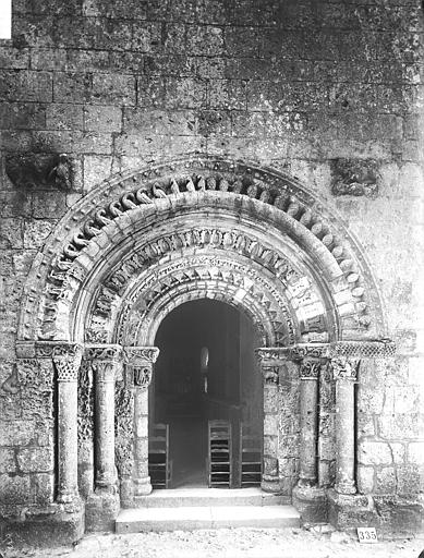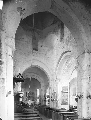 Eglise de plan cruciforme, avec trois absides dont deux seulement subsistent. La nef est un vaisseau unique comprenant, de chaque côté, trois arcades latérales en arc aigu, sur colonnes engagées à chapiteaux sculptés du 12e siècle. Deux baies romanes ont été remplacées au 14e siècle. Le clocher est bâti sur l'ancien transept, porté sur quatre arcades, une ogivale et trois en plein cintre, voûté d'une coupole à pans. Les colonnes et leurs chapiteaux sont identiques à ceux de la nef. La cage des cloches est une construction octogone, avec piles de colonnettes jumelées, base et chapiteaux sculptés, arcades géminées, corniches pourtournées sur des colonnettes d'angle... Les arcades de droite du choeur ont été mutilées au 13e siècle pour y créer une ouverture qui communique avec un bas-côté. Cette adjonction a amené la suppression de l'absidiole sud dont l'ouverture a été conservée.