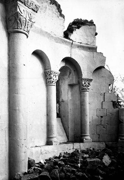 Eglise en forme de croix latine, à une seule nef, avec une croisée voûtée sur arcs diagonaux à une époque postérieure à la fondation de l'édifice. Le choeur comportait deux travées. A la suite, vient l'abside voûtée en demi-coupole. Cette voûte reposait sur une ordonnance de colonnes à chapiteaux sculptés, supportant une série de sept arcatures. La façade absidale était occupée par trois fenêtres simples au rez-de-chaussée et, à l'étage, par une galerie d'arcatures. Le clocher s'élève sur le choeur.