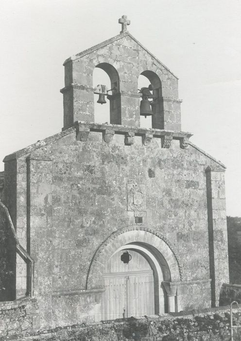 Eglise romane très remaniée, mais dont la façade a conservé son caractère primitif. Cette dernière s'ouvre par un portail en plein cintre sans tympan. Archivolte décorée d'étoiles en relief. Au-dessus, pierre encastrée, sculptée aux armes de France. L'écu sommé de couronne royale, est entouré des colliers des ordres du Roi. Corniche à modillons sculptés. Clocher-pignon à deux ouvertures.