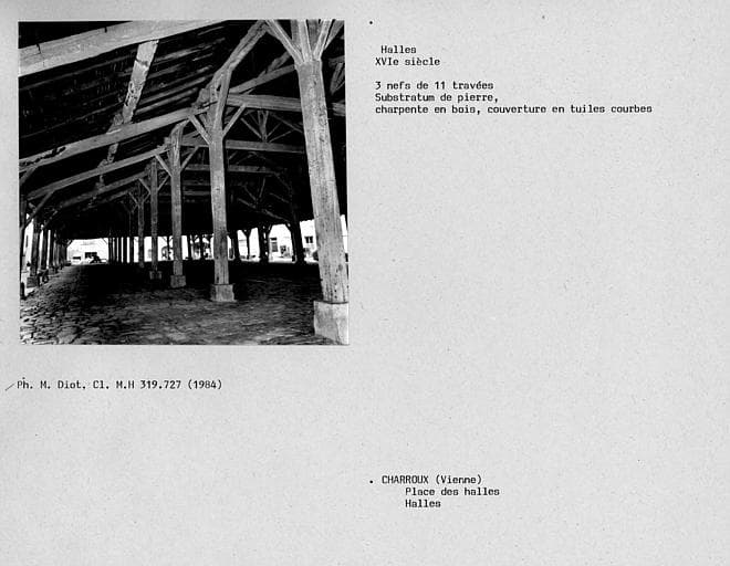 Halle composée de trois nefs sur onze travées, constituée d'une couverture en tuiles courbes sur charpentes en bois supportées par des poteaux également en bois posés sur des poteaux en pierre.