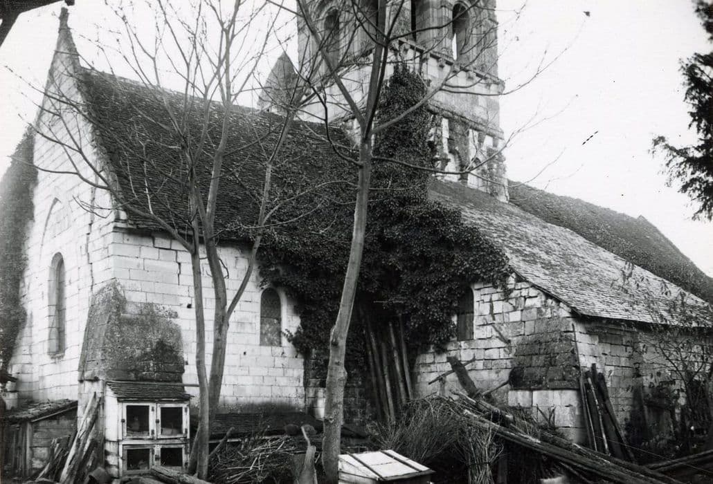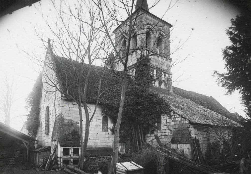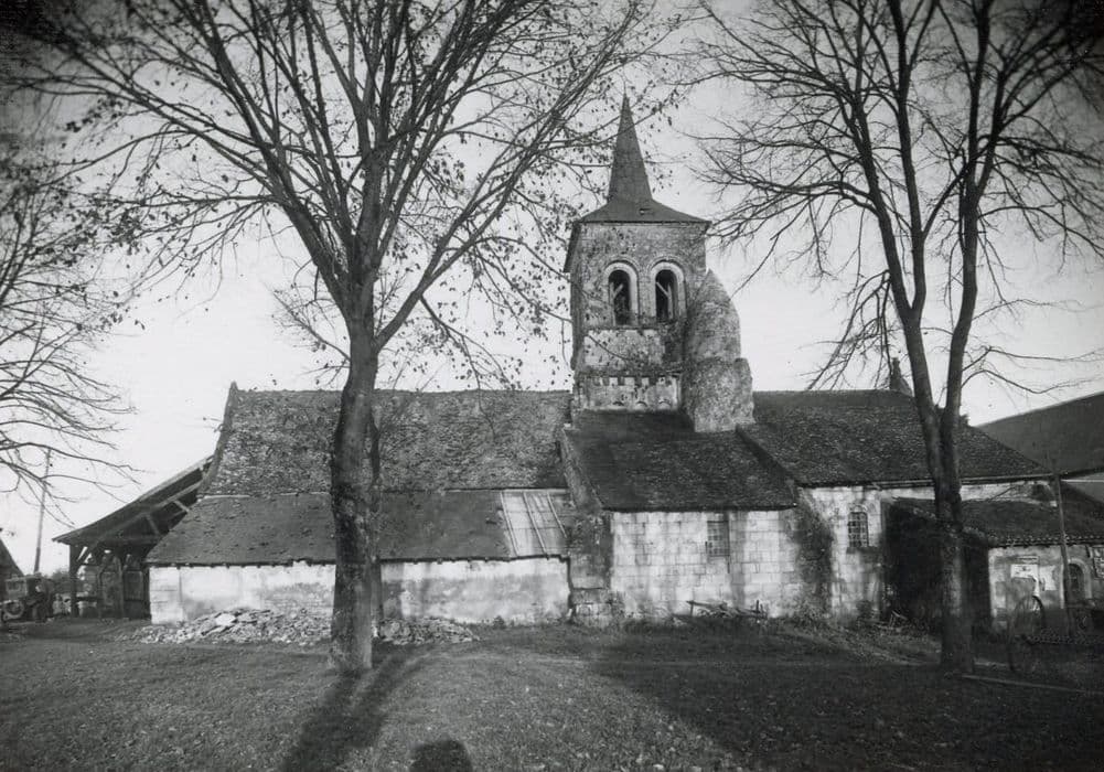 Un texte de 892 mentionne l'édifice. La cure est à la nomination du chapitre de Saint-Martin de Tours. L'édifice est orienté, à nef unique à l'origine et probablement terminé, avec les réfections du 15e siècle, par un choeur à trois absides semi-circulaires dont les amortissements se devinent encore côté nord. La façade à pignon est percée d'une porte en anse de panier surmonté d'une accolade moulurée qui semble dater du 15e siècle. Un grand auvent en bois appuie sur cette façade. A l'ancienne croisée du transept s'élève un clocher dont la touche est romane. Un étage ajouré y a été ajouté, sans doute à la fin du Moyen-âge. A l'intérieur, la nef primitive était sans bas-côtés et sans doute couverte en charpente. De conception massive, le carré du transept se compose de quatre grosses piles carrées contre lesquelles s'appuient des colonnes engagées surmontées de chapiteaux sculptés (têtes humaines, palmettes, sagittaires affrontés, rosette, quadrillage...). Les chapiteaux recevant la retombée des arcatures qui surmontent les passages latéraux donnant autrefois accès aux absidioles, sont également ornés (oiseaux, palmettes, sphinx, lions...). Les arcs plein cintre encadrent une coupole octogonale sur trompes. Le choeur a été refait à l'époque gothique.