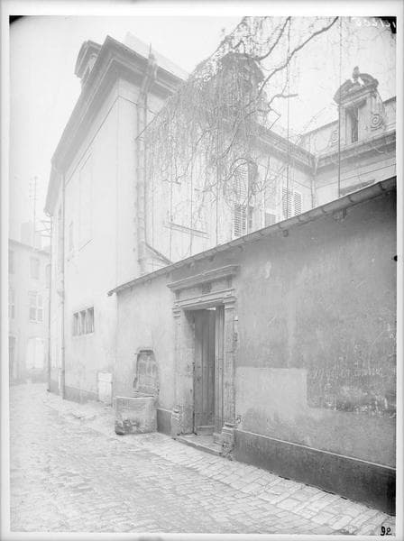 La porte d'entrée à chambranle et contrepilastres, avec fronton circulaire à volutes et cartouche central ainsi que les deux consoles l'accompagnant ; la cage d'escalier et la rampe en fer forgé : inscription par arrêté du 31 octobre 1941