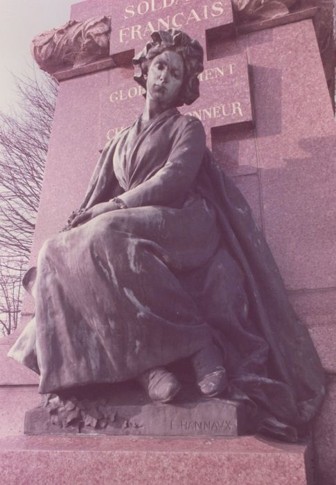 - Statue (h = 180 environ ; la = 120 environ) représentant l’allégorie de la Lorraine figurée sous les traits d’une femme assise, la tête baissée. Elle est vêtue d’une robe et d’un long manteau et porte une coiffe. De sa main gauche, elle retient des fleurs contre sa robe. De sa main droite, elle tient un écu avec les armoiries de la Lorraine. La signature du sculpteur figure sur la face avant du socle « E HANNAVX ».