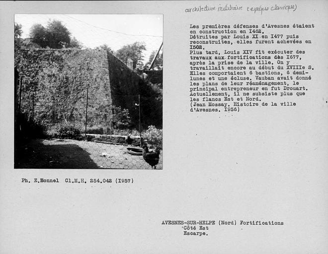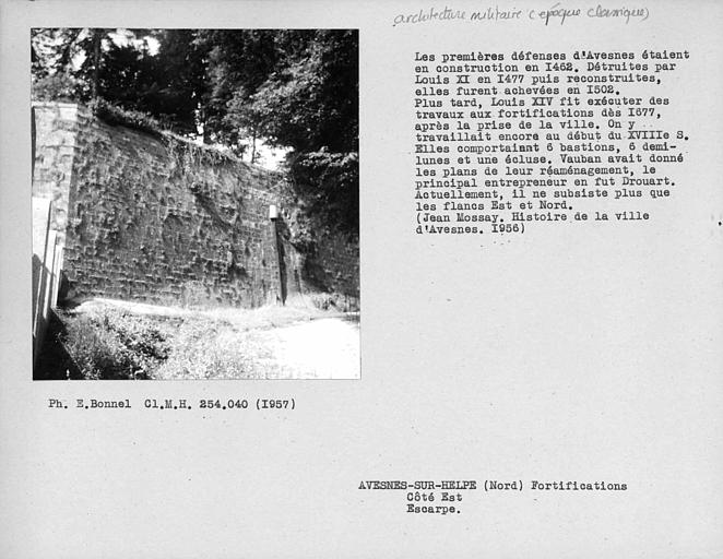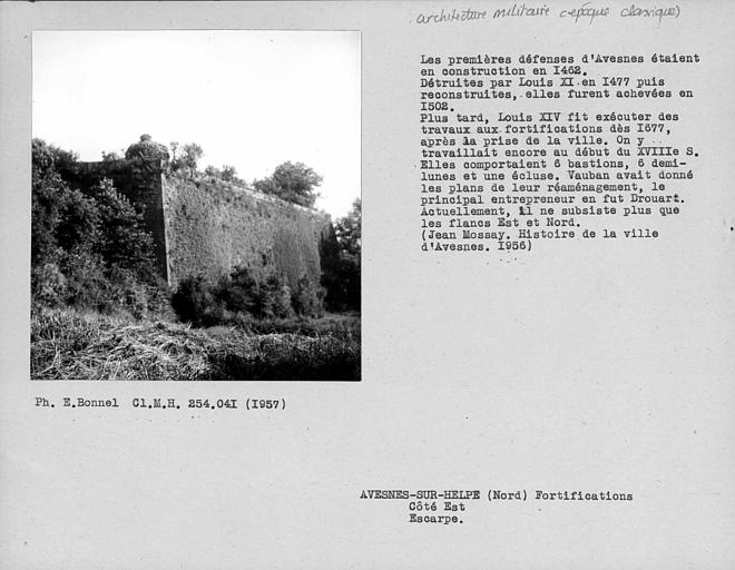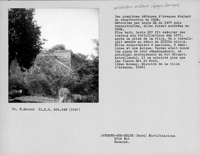 La Porte de Mons : inscription par arrêté du 15 mai 1944 - Les vestiges du donjon féodal, place Guillemin (cad. AH 282) : classement par arrêté du 23 juin 1981 Les sol et sous-sol des parcelles comprenant les vestiges des fortifications : front de Mons comprenant les vestiges du front de Mons, à l'exception de la porte de Mons déjà inscrite (cad. AE 284, 282, 283, 147, 148) ; écluse de l'entrée des eaux (pont des Dames) et son bâtiment, double bâtardeau (cad. AE 135) ; murs de contrescarpe adjacents (cad. AE 129, 136) ; demi-lune de l'inondation (cad. AE 388, 411) ; corps de garde (cad. AE 396, 395) ; poudrière (cad. AE 199) : inscription par arrêté du 23 juin 1995 - Le front de Mons : demi ; lune 11 du château ; Bénit (cad. AE 77, 79, 81) , bastion numéro 2 des Récollets (cad. AE 261 à 263) ; escarpe entre porte de Mons et bastion des Récollets (cad. AE 430, 370, 372, 220) ; bastion casematé numéro 8 (cad. AI 260, 262, 278, 279, 281, 368) ; demi-lune de France numéro 15, fossé et contrescarpe (cad. AI 554, 518, 556, 399 à 401, 553 à 551) ; bastion de France numéro 5, contrescarpe et escarpe (cad. AH 265, 262, 172, 234, 235) ; demi ; lune numéro 17 (Saint-Jean) (cad. AH 233) ; bastion Saint-Jean (cad. AH 176 à 181, 188) ; lunette 22 (cad. AH 222) : inscription par arrêté du 23 juin 1995 - Le bastion de la Reyne (cad. AI 646) , son fossé et sa contrescarpe (cad. AI 16, 21, 22, 26, 27, 15, 34, 633) : inscription par arrêté du 23 juin 1995