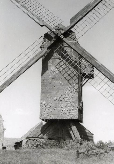Daté de 1802, ce moulin à farine, dit Ondankmeulen en flamand, déménagé de la Motte du Bois, près d'Hazebroucq, est un modèle pivot, typique des moulins du Nord, charpenté de bois. Sa lourde cabine s'appuie sur le pivot, épaulé par des étais obliques reposant sur une socle en pierre de taille. Ce pivot permet la rotation et une orientation face aux vents. La cabine, disposée sur deux étages et équipée de la machinerie meunière (une paire de meules) , est en essentages de planches verticales, avec toit en bâtière brisé et échelle extérieure ; les ailes à traverses présentent l'inclinaison classique qui optimise la prise au vent. Disposition d'un rendement jugé insuffisant, puisque le moulin fut équipé d'un moteur à gaz pauvre auxiliaire. Arrêté en 1958, le moulin a été restauré par la commune.