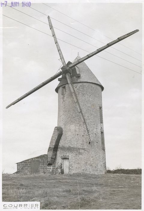 Mentionné en 1681 le Moulin-Neuf, ou Moulin de la Marmite, présente une tour en moellons de schiste légèrement tronconique (hauteur, 11 mètres) , surmontée d'une coiffe couverte de bardeaux de châtaignier. Rehaussé vers 1865 lors de l'installation d'ailes Berton (envergure, 17 mètres) , il compte trois étages. Les baies à arcs segmentaires à encadrements de brique sont de la même époque. Les capacités du moulin furent encore augmentées en 1930, grâce à un moteur à huile lourde Ruston-Hornsby, de 15 CV, fabriqué à Lincoln, conservé. Le rouet, en orme, et la transmission mettaient en mouvement deux paires de meules (diamètre, 1, 60 mètres) , tournant six fois plus vite que les ailes. L'arbre, les ailes et la toiture ont été refaits à neuf et, depuis le 27 décembre 1980, le moulin fonctionne à nouveau.