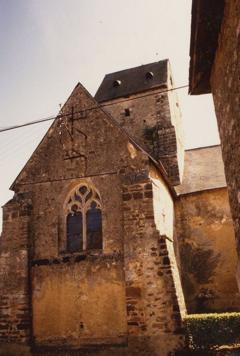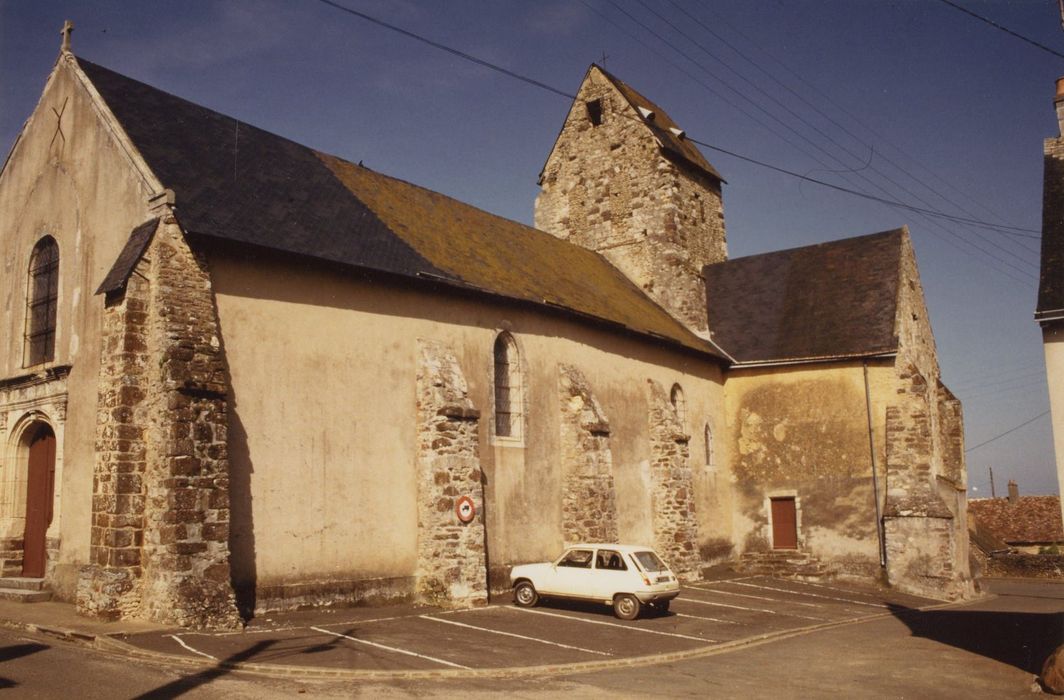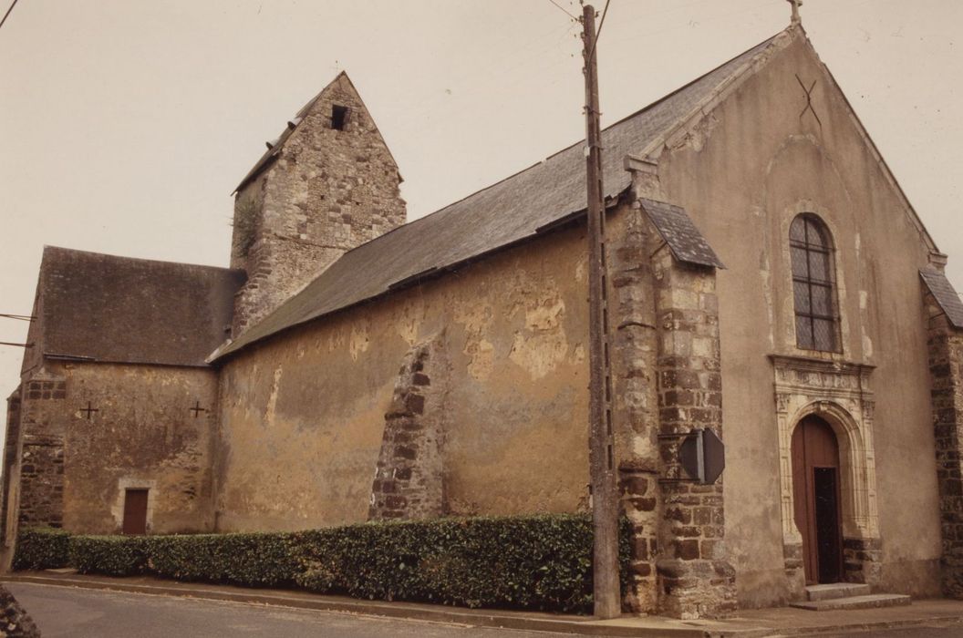 Dépendance de l'abbaye des religieuses bénédictines du Pré au Mans. Eglise romane en forme de croix latine, voûtée postérieurement et enrichie au 16e siècle (mobilier et portail ouest). Voûte lambrissée peinte de la fin du 15e ou du début du 16e siècle.