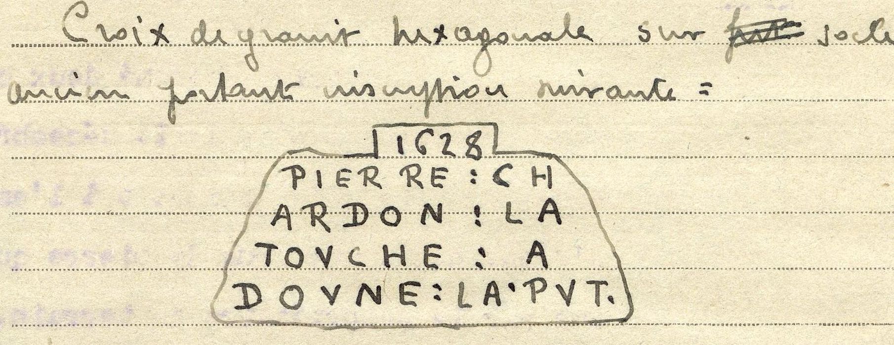 Croix de granit hexagonale sur socle ancien portant l'inscription suivante : "1628 PIERRE : CHARDON : LA TOVCHE : A DOVNE : LA PVT". Fût en trois morceaux. Bosses taillées dans le granit pour retenir le cercle de fer qui servait à buisser la croix à certains fêtes.