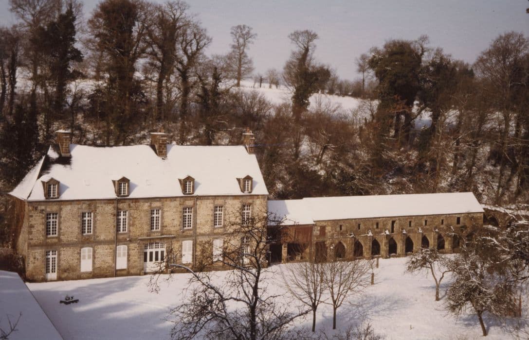 L'abbaye, de l'ordre des Prémontrés, a été fondée au 13e siècle, après la conquête de la Normandie par Philippe-Auguste. Jusqu'au 14e siècle, les monastères prémontrés accueillaient des frères convers dont le rôle était d'exploiter les terres dépendant directement de l'abbaye. Après la peste noire et la guerre de Cent ans, les abbayes ont fait exploiter leurs terres (salles) par des métayers. L'église, fondée en 1238, a sans douté été détruite à la Révolution. Construite au 14e siècle, la grange aux dîmes a été incendiée durant la guerre de Cent ans. Sa charpente a été refaite en 1460, reposant sur des poteaux placés sur un support de maçonnerie pour éviter de porter sur des murs fragilisés. La grange est une construction rectangulaire ajourée de fenêtres gothiques en arc lancéolé. La construction de la métairie a repris le principe de la charpente de la grange, avec une différence. Au lieu de faire reposer les poteaux en bois debout sur des socles de maçonnerie, ils portent sur de gros corbeaux saillants du mur. La métairie a été dédoublée au 17e siècle en Salles de Haut et Salles de Bas, avec une cour commune. La ferme des Salles de bas faisait partie de la mense abbatiale ; celle des salles de Haut relevait du tiers lot. £