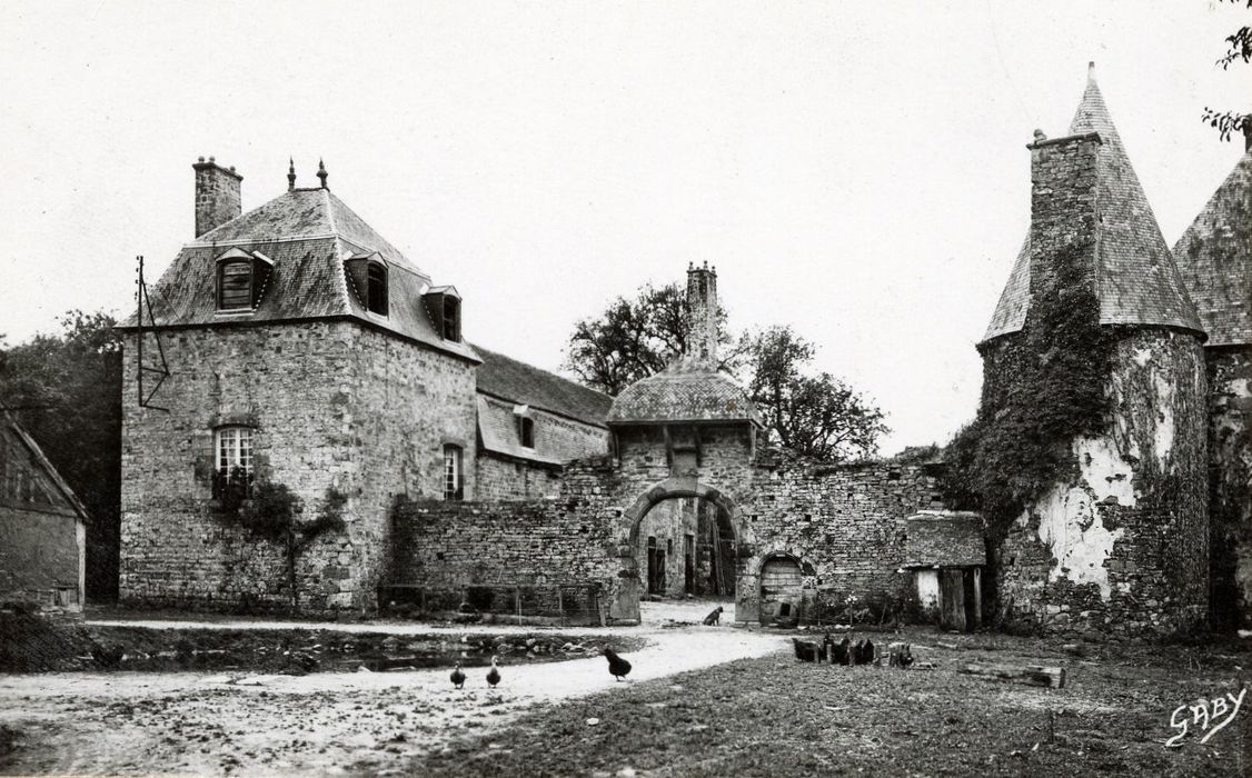 Ensemble de bâtiments édifiés de la fin du 16e au 18e siècle : chapelle du 14e siècle avec des vestiges de peintures murales, logis et tours de la fin du 16e siècle (inscription 1598 sur un linteau) , porche de 1598, pavillon du début du 17e siècle, écuries de 1764 (inscription sur la sablière) , pavillon du colombier du milieu du 18e siècle, cave de 1762 (inscription sur sablière) , fournil du début du 19e siècle.