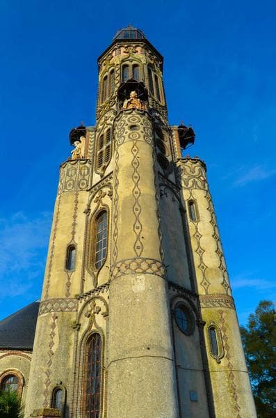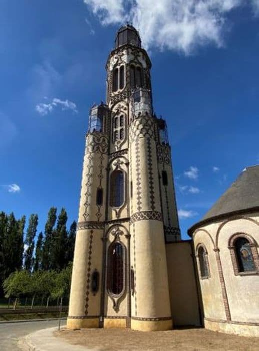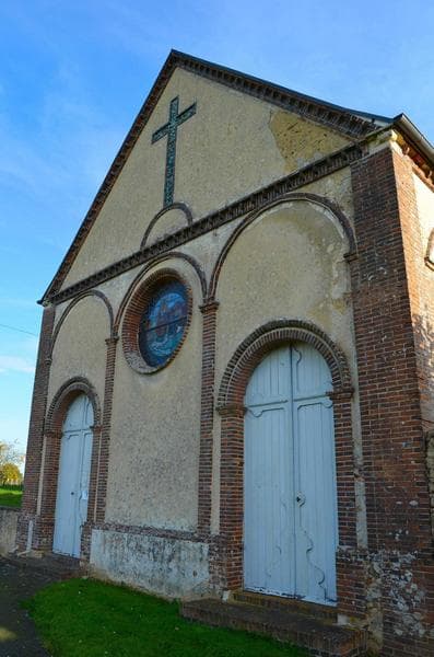 Cette église a été construite à l'instigation du curé, l'abbé Migorel. Lieu de mémoire et de pélerinage en l'honneur de N.-D. de la Salette. L'édifice comprend une nef unique de trois travées, un transept saillant et un choeur terminé par une abside. L'église est séparée de la tour par un couloir coupe-feu. L'accès à cette dernière se fait par une grande porte en briques dont les piédroits sont surmontés de chapiteaux néo-romans.