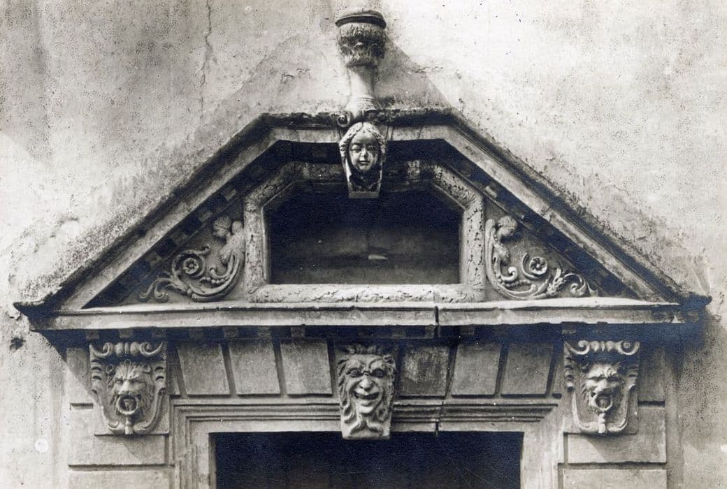Fronton triangulaire, percé d'une ouverture rectangulaire. Trois mascarons trapézoïdaux soutiennent l'entablement.