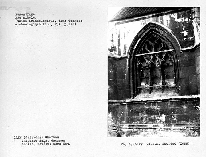 Le château de Caen a été fondé vers 1060 par Guillaume le Conquérant. Le donjon en pierre et la salle de l'Echiquier ont été élevés vers 1120 par Henri Ier Beauclerc, fils de Guillaume le Conquérant. Sous Philippe-Auguste, le donjon a été entouré d'une chemise flanquée de quatre tours circulaires et bordée de fossés. Au 14e siècle a été construit un logis (actuel logis du gouverneur) , remanié aux 16e et 18e siècles. L'église Saint-Georges, du 12e siècle, a été remaniée au 16e siècle (la nef lambrissée a gardé son ossature et ses fenêtres romanes). A partir du 17e siècle, le château a perdu son usage défensif et est devenu un lieu de garnison. Après la Révolution, donjon a été arasé, les fossés comblés et le site affecté à l'armée.