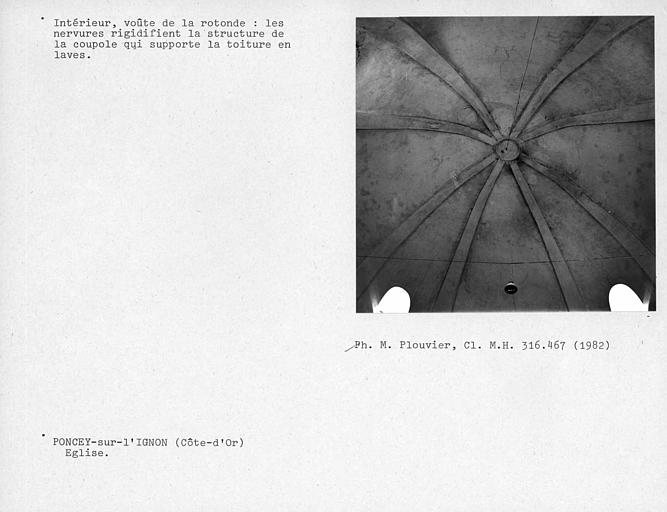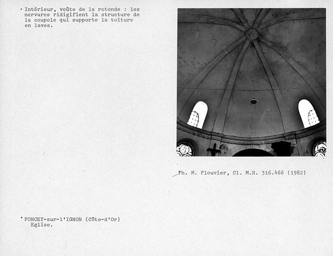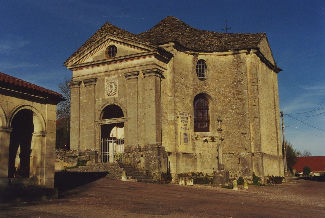 Eglise bâtie de 1785 à 1787 sur un plan original en Côte d'Or non révélé par l'enveloppe extérieure : édifice à plan composé associant le plan centré de la nef flanqué de deux chapelles latérales de plan rectangulaire, précédé d'un porche et prolongé d'un choeur rectangulaire. Une petite sacristie de plan carré se site dans l'axe de l'église, derrière le choeur. La nef est couverte d'une coupole à nervures et clés annulaires. Entre les nervures ont été insérés quatre oculi ovales superposés aux baies. Le choeur est couvert d'une voûte d'arêtes.£