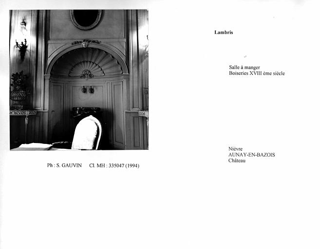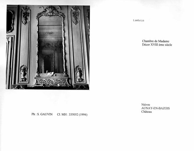 Château, y compris l'ensemble des boiseries, lambris et tapisseries ornant le rez-de-chaussée et le 1er étage ; communs ; fossés, cour d'honneur ; jardins ordonnancés ; jardin potager ; mur de clôture (cad. A 240 à 249) : classement par arrêté du 24 octobre 1988