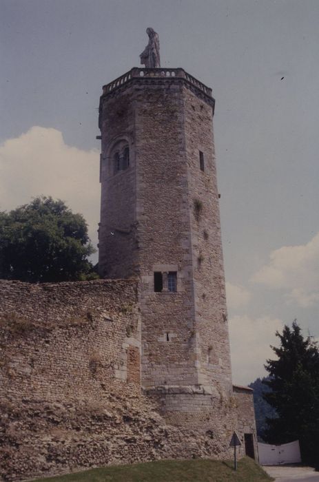 La tour, construite au 12e siècle sur des substructions gallo-romaines, est un des rares vestiges du château détruit à la fin du 16e siècle ; tour donnée en 1647 aux Ursulines, puis après la Révolution aux Visitandines. Statue placée au sommet de la tour entre 1859 et 1862 par le sculpteur Quarre.