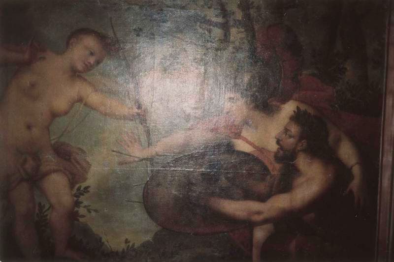 Lambris peints, quatre panneaux de vitraux du 13e siècle provenant de la Sainte-Chapelle de Paris.