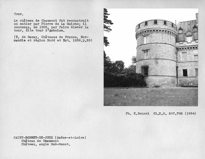La châtellenie de Chaumont est attestée à la fin du XIe siècle ou au tout début du XIIe siècle. A partir des années 1490-1500, Pierre de Laguiche (1464-1544), conseiller, chambellan et ambassadeur du roi, entreprend la construction d'un nouveau corps de logis dans un style Renaissance inspiré des demeures royales du val de Loire. Le chantier est poursuivi par son fils jusqu'à la fin du XVIe siècle. Le château s'organise alors autour d'une cour orientée et ouverte au nord-est, avec un accès à l'est où est encore conservé un châtelet d'entrée avec son pont-levis. En 1696, la seigneurie de Chaumont devient la propriété de Charles III de Rohan (1655-1727). A la Révolution, le château et son domaine tombent en ruine. Louis de Laguiche prend possession du domaine au début du XIXe siècle. L'aménagement du parc paysager, dans les années 1837-1838, est dû à Châtelain : perspectives paysagères, saut-de-loup, tracé des allées, plantation de bosquets, construction d'une glacière