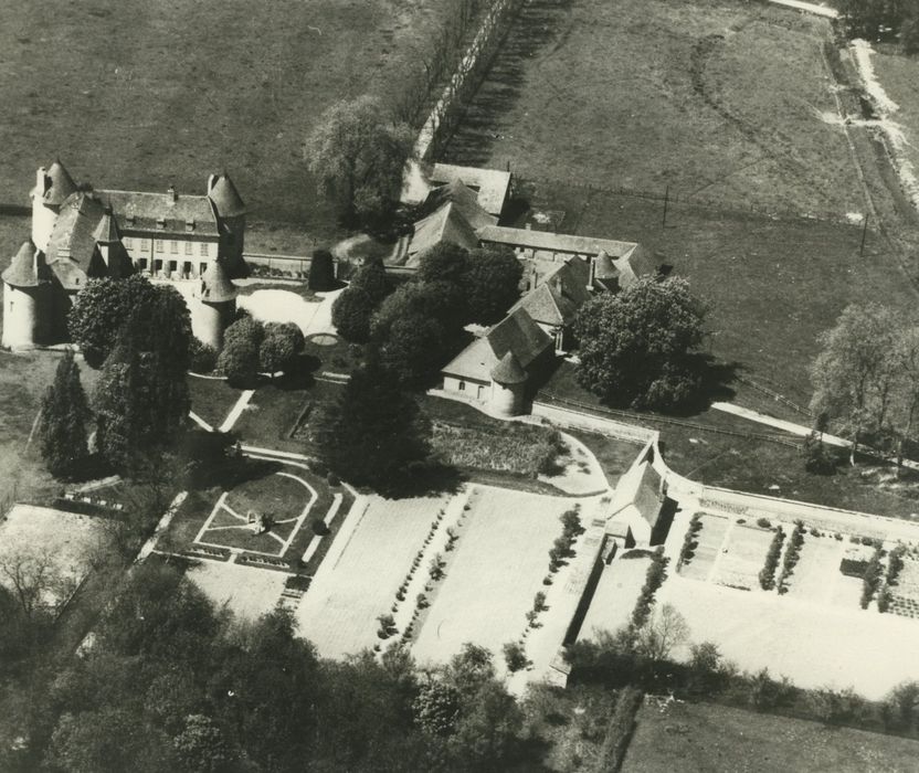les façades et les toitures des deux bâtiments d'entrée avec leur tour ; le portail d'entrée entre ces deux bâtiments ; les façades et les toitures du corps de logis, de l'aile en retour et de la tour (cad. C 497, 500, 529) : inscription par arrêté du 27 juin 1983