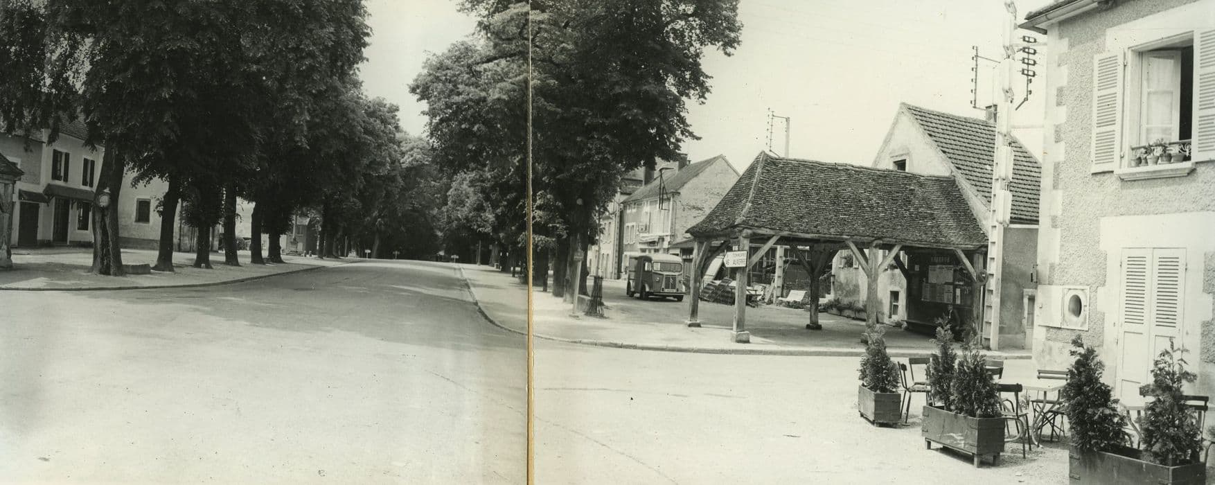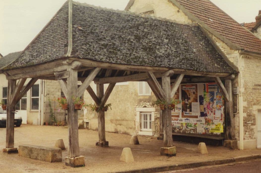 Les deux halles ont été construites au 16e siècle, sur l'ordre de Louise de Monmorency, châtelaine de Tanlay, qui avait obtenu de François Ier l'autorisation de créer des foires. Elles sont identiques, placées de part et d'autre de l'entrée de l'allée de tilleuls qui mène au château. Leur toit à trois pentes est couvert de petites tuiles plates et soutenu par six piliers en bois montés sur de petits socles de pierre.