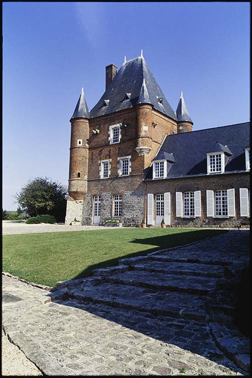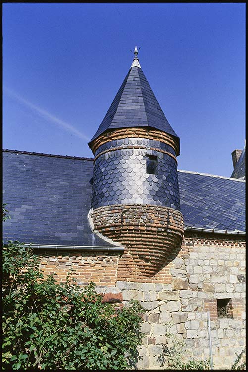 Tour Louis XIII avec tourelles en encorbellement, murs de briques roses avec soubassements en grès, ancrages en fer forgé précisant la date de 1611, époque de la construction par la famille de Maubeuge. Salle des gardes voûtée au rez-de-chaussée. L'aile en brique contiguë date de 1722.