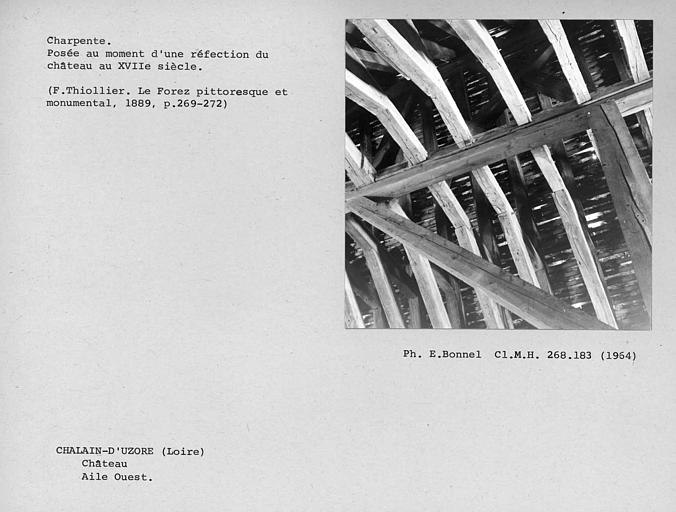 Galerie sur le côté Est de la cour intérieure ; cheminée et porte Renaissance de la grande salle au rez-de-chaussée ; cheminée de la bibliothèque au rez-de-chaussée ; cheminée du petit salon provenant du château de Goutelas, au rez-de-chaussée (cad. A 97) : classement par arrêté du 11 juin 1980 ; Le château de Chalain d'Uzore sis 8 b chemin du château en totalité à l'exclusion des parties déjà classées soit : le logis en totalité, la poterne en totalité, les façades et toitures de tous les communs, les puits, le pigeonnier, les jardins en terrasse avec les serres, les clôtures et leurs portes, le tout, ainsi que les parcelles sur lesquelles le domaine se trouve cadastré section A n° 97, 82, 95, 98, 93 et 94 : inscription par arrêté du 22 juin 2015