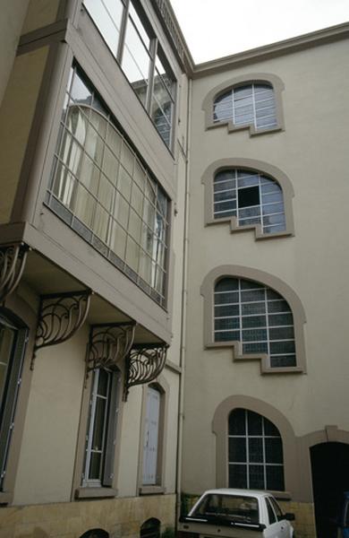 Façades et toitures ; espace intérieur avec hall, cage d'escaliers et vitraux (cad. AB 104) : inscription par arrêté du 21 février 1989