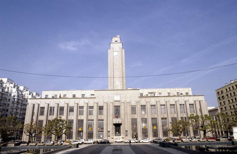 Hôtel de ville destiné par le maire, Lazare Goujon, à servir de nouveau centre urbain à la commune de Villeurbanne, face à la volonté hégémonique de Lyon. Il fait partie de l'ensemble des immeubles dits la "Cité des Gratte-ciel", construits par l'architecte Môrice Leroux de 1931 à 1934. L'architecte de l'hôtel de ville, choisi sur concours, est Robert Giroud, premier Grand Prix de Rome en 1922. Avec ses colonnes sans chapiteaux et sa tour-beffroi, l'édifice, inauguré en 1934, est caractéristique d'un certain ordre monumental des années 1930. Il conserve intact son décor intérieur d'origine, traité en céramique, en marbre bleu et noir, en acajou, fer et cuivre.