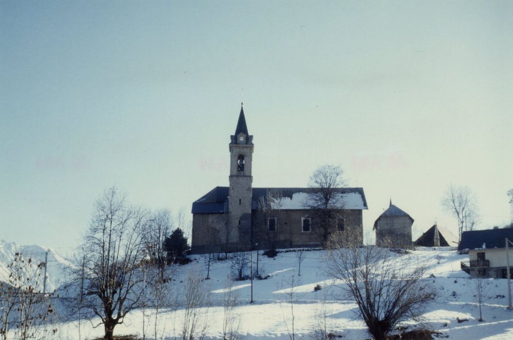 Après une destruction partielle de l'église antérieure due à la foudre, reconstruction d'un nouvel édifice dans la seconde moitié du 17e siècle. La voûte à pendentifs de l'avant-choeur est ornée d'un décor de médaillons de stuc, réalisé par le sculpteur en plâtre Dominique Blanc et Claude-François-Antoine de Morillon. La flèche du clocher, abattue à la Révolution, a été refaite en 1864 après un exhaussement de trois mètres. Le décor intérieur et le mobilier sont refaits au cours du 19e siècle : retable restauré en 1813 par le sculpteur Perracio, chaire de 1823, table de communion de 1837, tribune de 1827, maître-autel refait en 1850 par les frères Gilardi, peintures murales, ... A proximité, se trouve la croix autrefois située au centre du cimetière, déplacée aujourd'hui à côté de la chapelle de la Salette. Elle fut érigée en 1720 par la confrérie du Saint-Sacrement : il s'agit d'un petit monument en tuf, pilier pyramidal surmonté d'une sphère supportant une croix métallique éxécutée par Claude Marchal.