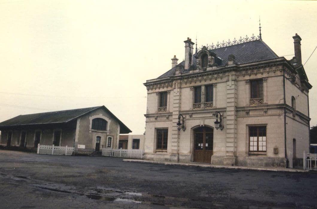 Cette gare fait partie de la ligne à voie ferrée métrique le Blanc-Argent (ou B.A.). Elle a été dessinée dans un style néo-Renaissance par l'architecte F. Houssin, en référence au château voisin. Construite en pierre de taille et décorée de sculptures. Une frise décorative en zinc souligne le faîte du toit. A gauche de la porte centrale a été posée l'horloge commune à toutes les gares du B.A., mais installée ici dans un cadre de pierre plus orné qu'ailleurs. A droite se trouve le plan de la ligne gravé sur une plaque de marbre blanc. Des lanternes de style Art Nouveau, suspendues à des potences en fer forgé, éclairent l'horloge et le plan. L'établissement comprend aussi une halle à marchandises indépendante du bâtiment des voyageurs qui ne comportait que deux travées vers 1910, ultérieurement portées à quatre, et une remise à machines avec château d'eau en briques.