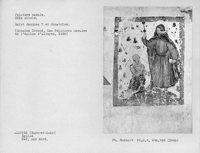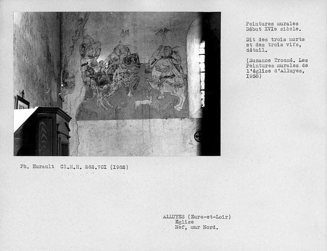 L'église, qui date du 12e siècle, a bénéficié de l'élan de rénovation et de construction des 15e et 16e siècles. L'édifice qui se composait d'une nef lambrissée et d'un choeur à chevet en hémicycle, a été agrandi au début du 16e siècle d'un bas-côté construit dans un style mêlant les répertoires gothique et Renaissance. Le Mécénat de Florimond Robertet, trésorier de France, au début du 16e siècle touche également le décor intérieur dont les peintures murales offrent une représentation rare du Dit des Trois morts et des Trois vifs. Les sujets représentés peuvent être vraisemblablement liés à une épidémie. L'église a subi peu de transformations depuis le 16e siècle, hormis la flèche d'ardoise reconstruite au 19e siècle.