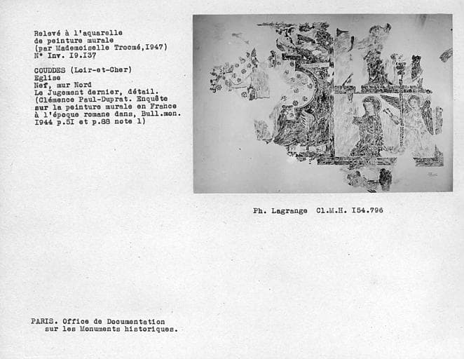 La paroisse devrait sa naissance à l'établissement d'ermites envoyés de l'abbaye de Saint-Martin-de-Tours dès le 5e ou 6e siècle. L'édifice actuel présente, dans les murs de la nef, des restes importants d'un petit appareil qui pourrait remonter au 11e siècle. Au 12e siècle, la porte occidentale a été diminuée de hauteur avec la construction d'un arc. Le choeur et la chapelle seigneuriale ont été édifiés au 16e siècle. A l'intérieur, l'édifice conserve des peintures murales dont la plus ancienne remonte à la fin du 12e siècle, et représente la comparution de Saint-Christophe devant le roi Dannus. Une deuxième campagne de peintures, au 14e siècle, figure le Jugement dernier ainsi qu'une scène avec un chevalier. Au 15e siècle a été peinte la figure monumentale de Saint-Christophe. Au 19e siècle, un décor de pilastres en trompe l'oeil vient recouvrir la partie basse des peintures anciennes.