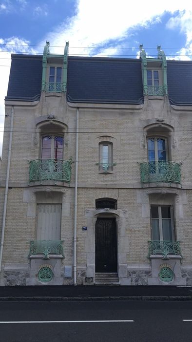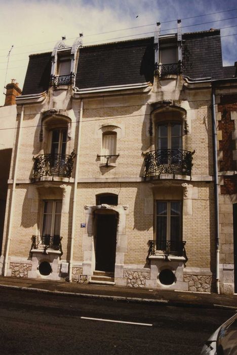 Cette maison, réalisée par l'architecte C. Coursimault, possède une façade représentative de l'Art Nouveau à sa période de maturité. La façade s'organise symétriquement autour de la porte d'entrée, placée au centre de la composition, et qui détermine de chaque côté une travée à trois niveaux de baies. Le rez-de-chaussée est accessible par trois marches menant à la porte d'entrée ornée d'un motif symétrique de volutes et protégée par un linteau de pierre saillant, à motifs en relief de volutes, soutenu par des piédroits de pierres harpées. A l'intérieur, les seuls décors conservés sont situés dans l'entrée (sol en mosaïque ; plafond à motif de feuilles) et le hall d'entrée (sol en mosaïque ; plafond compartimenté à motifs floraux ; escalier droit à balustres).