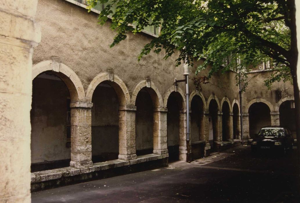 Cour du cloître et les deux niveaux superposés de galeries ; façades et toitures des trois bâtiments anciens en U entourant le cloître ; les trois escaliers intérieurs à volées droites et balustres tournés placés chacun dans l'une des ailes ; façades et toitures du bâtiment d'entrée sur la rue Jean-Jaurès construit par l'architecte Philippon (cad. AO 296) : inscription par arrêté du 11 avril 1994