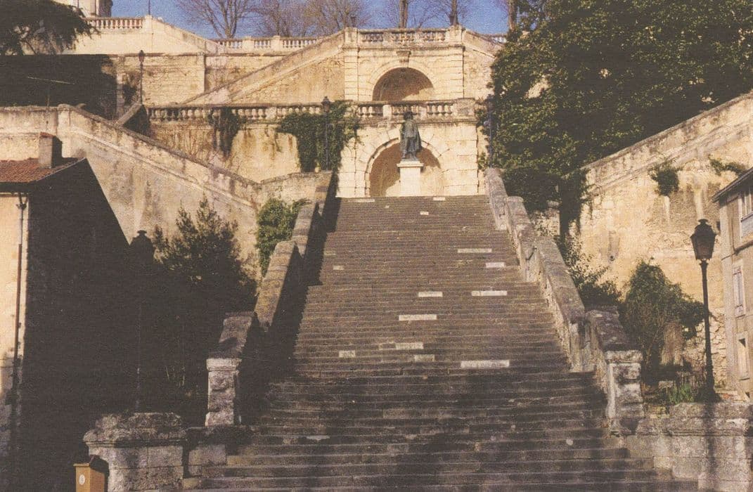 Monseigneur de Salinis, au milieu du 19e siècle, donna l'impulsion nécessaire à la modernisation et à l'urbanisation d'Auch. Le projet consistait, pour l'essentiel, à dégager la cathédrale après avoir mis au point le réseau d'adduction d'eau potable et l'éclairage des rues, et en reliant la ville haute et la ville basse par la construction d'un escalier monumental de 330 marches, inauguré en 1863. La première terrassse est occupée par la statue de D'Artagnan, dans un jardin dont les angles sont occupés par deux banquettes en demi-cercle. Une fontaine est adossée au mur de la terrasse supérieure. Un bassin complète l'ensemble. Puis, les volées doubles se déploient pour mener à une deuxième terrasse occupée par deux parterres et une autre fontaine. La volée double à montées convergentes donne accès à une volée centrale, puis deux volées divergentes mènent latéralement à la place Salinis conçue comme un balcon.