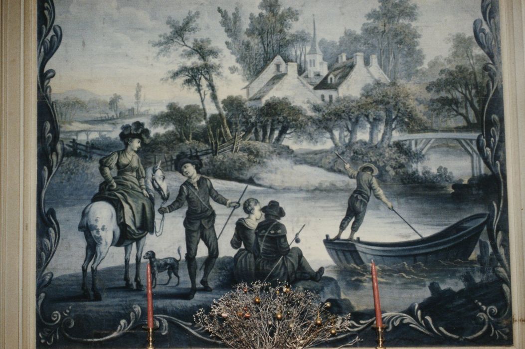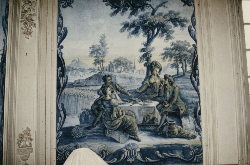 Décor de boiseries caractéristiques du style Louis XVI et de toiles peintes évoquant la tapisserie française et flamande de la fin du 18e siècle.
