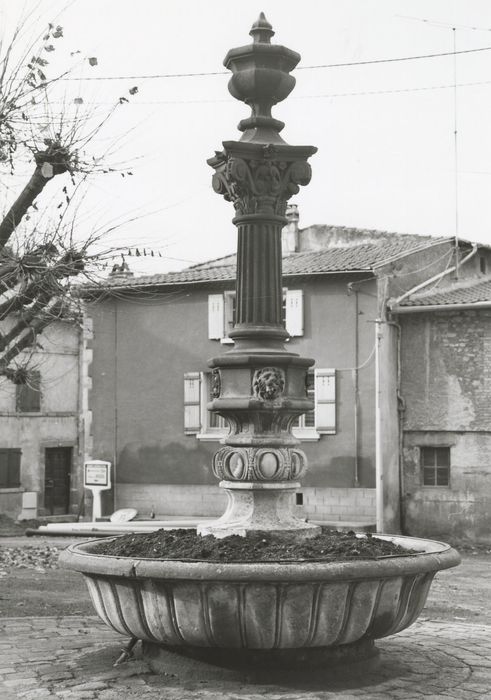 Campagne d'aménagement urbain sous le Second Empire, en 1857-1858 : construction des fontaines (dues à l'architecte clermontois Taché et réalisées par le sculpteur Pierre Béraud) , de l'hôtel de ville...£Cette fontaine présente un décor varié, formé par la superposition d'éléments décoratifs empruntés à l'art romain au travers de la Renaissance. L'ouvrage montre le goût pour l'éclectisme de son créateur, et se veut un témoignage de ce courant, rare dans le Puy-de-Dôme.
