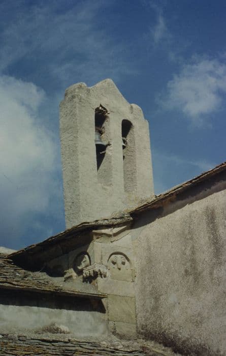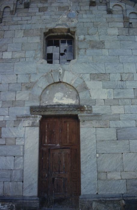 Ancienne église piévane, l'édifice présente un plan en croix latine et une juxtaposition de deux styles : une nef romane du 12e siècle, un chevet et un transept réalisés au début du 17e siècle. L'appareil roman est réalisé en dalles de schiste vert. Le linteau de la porte principale, surmonté d'un tympan, est décoré d'une frise et repose sur deux consoles gravées de masques lunaires. A l'intérieur, la nef se termine par un choeur semi circulaire, couvert d'une demi coupole qui s'est effondrée en 1994. Le décor stuqué a été réalisé à la fin du 17e siècle.