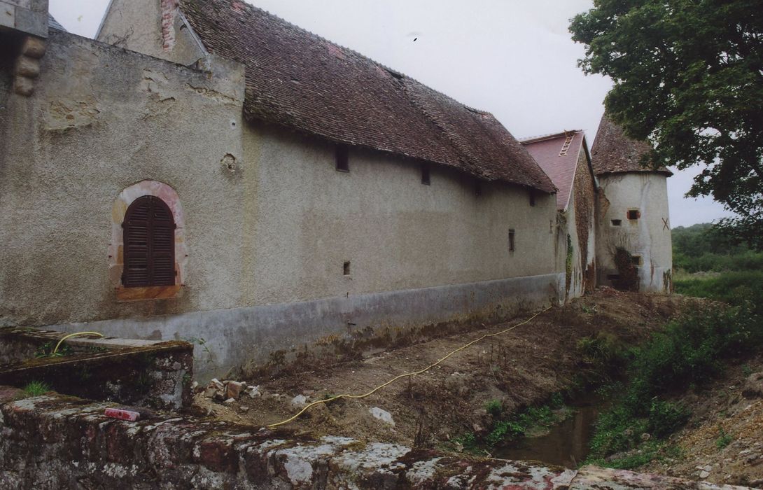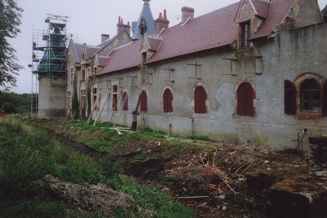 L'ancien château fut le fief d'une seigneurie pouvant être considérée comme l'un des jalons de l'implantation des Bourbons dans la partie orientale de leur territoire. Bâti dans un ravin et entouré d'un étang artificiel, l'édifice était constitué de deux corps de logis en L, flanqués de tours rondes ou carrées et disposés, selon la typologie des châteaux-cours, autour d'une cour fermée par une courtine. Certains détails d'architecture accusent une construction du 14e ou du 15e siècle. Des communs et une chapelle sont édifiés du 16e au 18e siècle, réalisés, comme le château, dans un mélange de grès local ocre et rouge. Un nouveau château est construit au 20e siècle, délimitant ainsi une cour d'honneur. Ce dernier édifice adopte un style éclectique mêlant le néo-gothique au classicisme à l'italienne (galerie à arcades). L'ancien château, aujourd'hui en ruine, a été habité jusqu'à la Révolution.