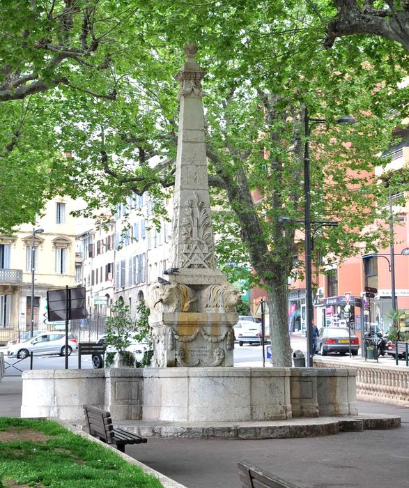 En 1781, le conseil municipal demande un devis pour la construction d'une fontaine en haut du Cours. Ce projet est appuyé par une demande de riverains en 1788. La même année, le maire consul de grasse demande que soient établis un plan et un devis d'une fontaine. L'installation est prévu "au coin de l'angle en forme de clavecin" en se raccordant au canal projeté par l'hospice. Le divis est réalisé, une partie du conseil privilégie une installation en haut du Cours sans avoir gain de cause. Le projet n'est pas réalisé. La Révolution remet le projet à l'ordre du jour. En 1792n les consuls de la municipalité délibèrent en faveur de la construction d'une fontaine publique en haut du Cours. Le plan de la "fontaine à pyramide" est confié à l'architecte Jacques Quine (1759-1839). Ce plan est modifié le 1er vendémiaire An VII (22 septembre 1798), avec la collaboration du fontainier François Daumas. Le 11 brumaire An VII (1er novembre 1798), la construction de la fontaine est attribuée aux enchères à Scipion Théas, parfumeur, qui en devient propriétaire. La construction est décidée un mois plus tard suites aux demandes de riverains d'avoir accès à l'eau potable à proximité de leur habitation. Le 21 ventôse An VIII (12 mars 1800), la fontaine est en partie construite. L’administration municipale reproche à Scipion Théas une exécution imparfaite du devis. Des parties seulement ébauchées et la terre issue du terrassement n'a pas été déblayée du cours et du chemin.