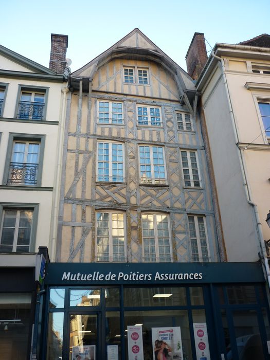 Le bâtiment sur cour avec son décor, datable des années 1560-1580, fait supposer une reconstruction à cette époque. La façade présente trois niveaux. Le rez-de-chaussée n'a gardé aucune façade, seul apparaît à gauche le pilier en pierre portant la sablière du premier étage. Peut-être faut-il imaginer un rez-de-chaussée en pierre. Le premier étage a conservé une petite partie de son décor. Celui-ci permet de reconstituer la disposition de l'ensemble de la façade : quatre travées séparées par des pilastres corinthiens. Les allèges sont scandées de petits potelets. Celui qui est conservé à gauche montre une grande qualité de sculpture. Une partie des autres, bûchés lors du crépissage de la façade ont été remplacés par des copies du potelet sculpté. Au deuxième étage les éléments sont mieux conservés et montrent aussi une qualité de sculpture très intéressante. A l'intérieur les cheminées des deux premiers niveaux sont conservées. Celle du rez-de-chaussée présente deux têtes de lions sculptées ainsi qu'un décor de plafond, à côté de la hotte, d'une grande finesse. La cheminée du premier étage est aussi du 16ème siècle. Sur le plafond sont sculptées des armoiries qui pourraient donner l'identité du constructeur du bâtiment. On voit les armes de la famille de Huez alliées aux armes d'importantes familles troyennes (Largentière, Marguenat, Angenoust).