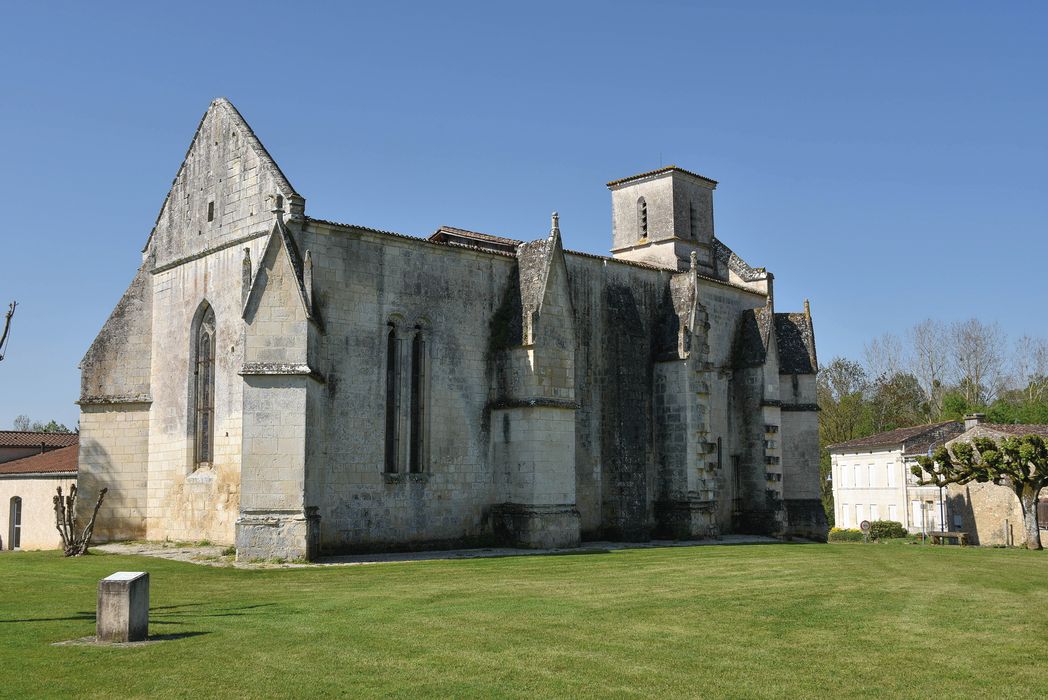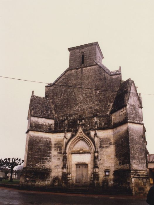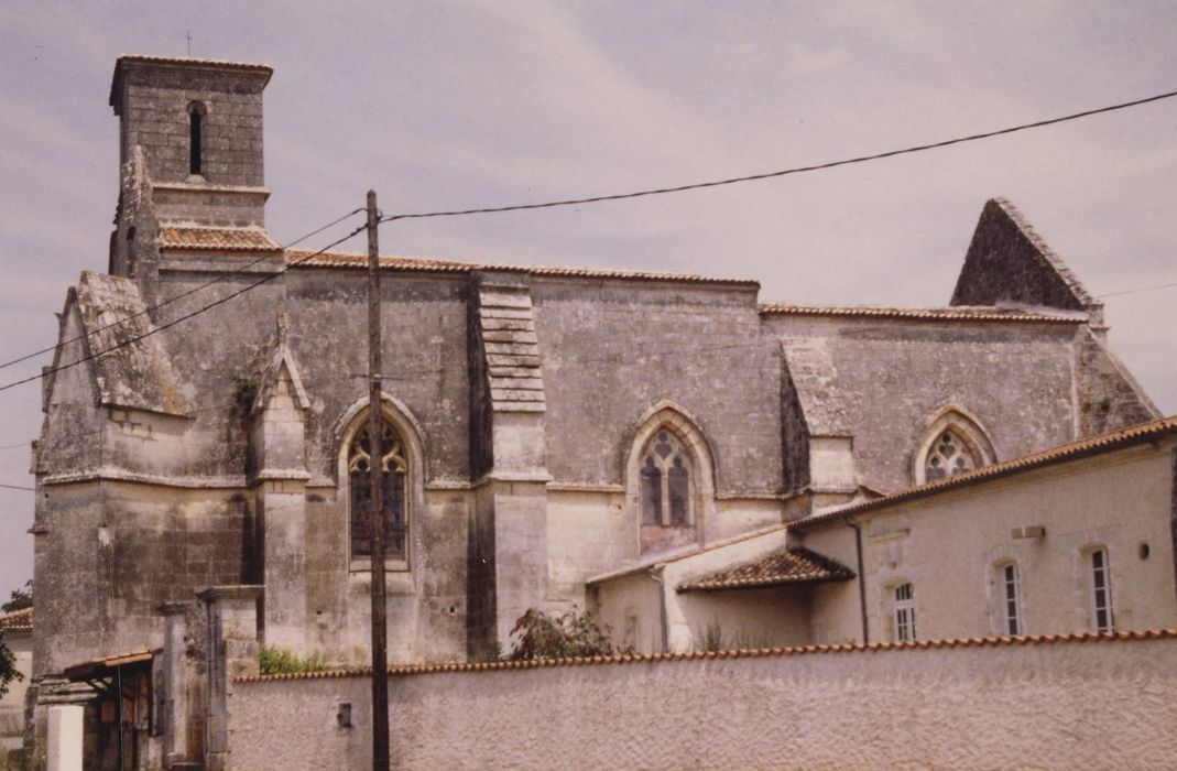Edifice d'origine romane. Au 13e siècle, il reçoit un chevet plat et des voûtes d'ogives disparues, dont il subsiste des vestiges dans les combles. Probablement ruiné pendant la guerre de Cent ans, l'édifice est reconstruit dans le courant du 15e siècle. Il se présente comme un rectangle épaulé, sur chaque angle et sur les longs côtés, par de puissants contreforts. La façade s'ouvre par un portail gothique flamboyant, avec archivolte à crochets et fleurons, et son pignon est couronné par un petit clocher quadrangulaire. Baies en arc brisé, à remplage flamboyant. Le mur nord est représentatif des trois étapes de construction de l'édifice : la travée ouest est en partie romane, celle de l'est date du 13e siècle et la médiane du 15e siècle. A cette dernière époque, une chapelle gothique était prévue de ce côté, mais n'a jamais été terminée. Au revers de la façade, le clocher a nécessité la construction de puissants massifs entre lesquels prend place une tribune couverte d'une voûte barlongue percée d'un large oculus. En Saintonge où les églises romanes sont majoritaires, cette église est l'un des exemples peu fréquents de construction gothique aboutie.
