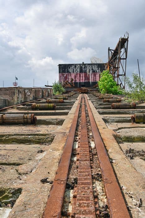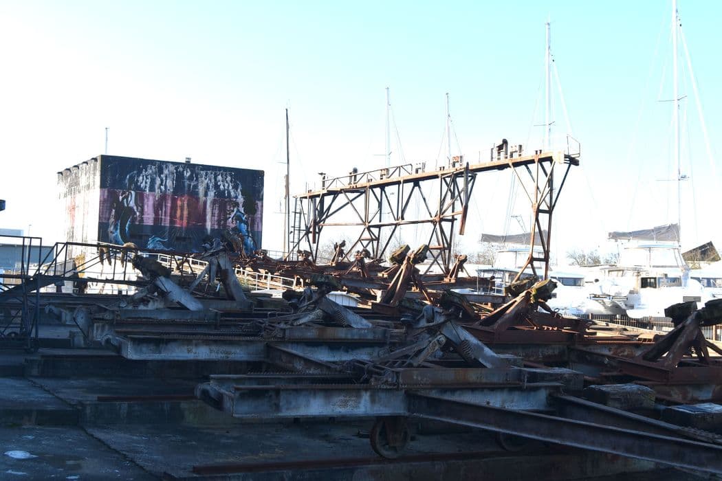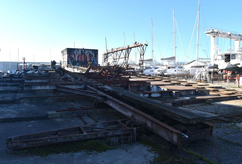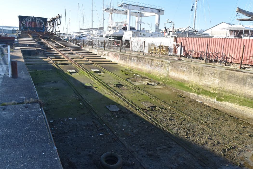 Slipway construit par les Allemands en 1942-1943, et introduit dans un important dispositif qui comprend la base sous-marine de La Pallice. Le mécanisme provient d'un port néerlendais. Après la guerre, il est affecté à l'entretien des chalutiers de 500 tonnes maximum. En 1959, les mécanismes situés sur la rampe (le ber) sont remplacés, modernisés et complétés. Le slip way comprend une rampe en béton armé, constituée de petits emmarchements, de pente estimée à 5°, large d'environ 15m et longue de quelques 200m dont 120 sous l'eau. Ce plan incliné est équipé de quatre rails, d'une crémaillère centrale et de rouleaux en bois. Elle reçoit deux chariots en IPN rivetés, hissés grâce à deux câbles en acier, reliés chacun à un énorme treuil à moteur électrique. Le ber latéral possède une structure en béton armé à emmarchements successifs, dans laquelle sont noyés sept rails horizontaux et des poulies de renvoi des câbles. Le slip way de La Rochelle constitue un exemple représentatif de ce type d'engin de carénage, qui sont construit dans les grands ports de France et du monde depuis la fin du 19e siècle. Il a conservé tout son équipement (à part la grue) des années 1942-1943 et 1959.