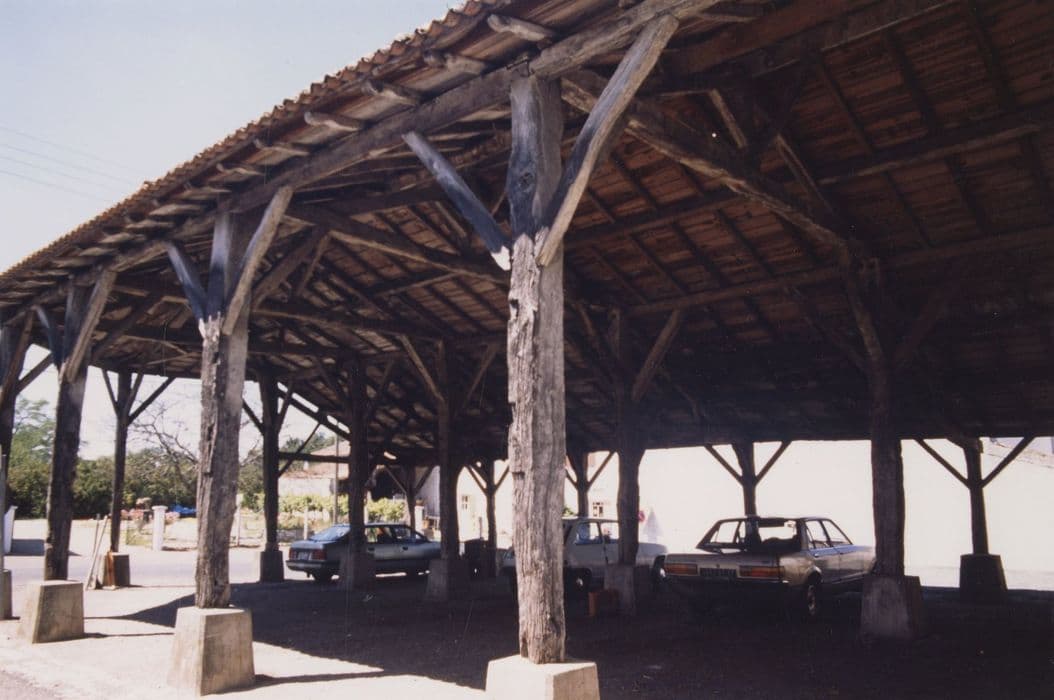 La première halle a été construite au 16e siècle. Implantée au centre du bourg, la halle actuelle peut remonter au 17e siècle. Couvrant un rectangle d'environ 10x20m, elle s'appuie contre une maison du bourg sur son côté est. Elle se compose d'un vaisseau principal et d'un bas-côté nord. L'angle sud-ouest, formé par le croisement des rues, a été coupé tardivement pour faciliter la circulation. La structure, assemblée à tenons et mortaises à mi-bois, est une charpente à pannes portée par dix grands poteaux et six poteaux plus petits, chacun doté d'un épaississement asymétrique de la tête. Les bases en pierre de taille ont été coulées dans du béton coffré. Le sol conserve un cailloutis aux endroits non goudronnés.
